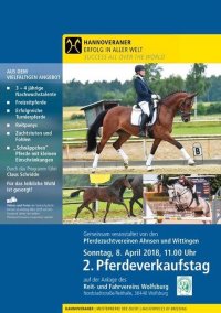 Am Sonntag, den 08. April veranstaltet der Pferdezuchtverein Ahnsen und Wittingen auf der Anlage des Reit- und Fahrvereins Wolfsburg seinen 2. Pferdeverkaufstag. Ab 11 Uhr werden die Verkaufspferde im Freispringen/Freilaufen oder unter dem Sattel vorgestellt. Anschließend besteht die Möglichkeit die gerittenen Pferde auszuprobieren. Angeboten werden neben 3 – 4 -jährigen Nachwuchstalenten auch Freizeitpferde, erfolgreiche Turnierpferde und Reitponys. ...