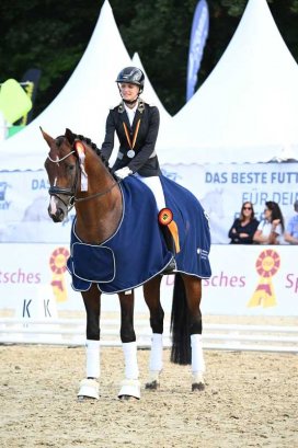 Was für ein Krimi bei den 4-jährigen Hengsten… Benjamin Franklin v. Bon Vivaldi NRW – Royal Blend (Z.: Wilhelm Kamps, Cuxhaven) ist in Warendorf zum Vize-Bundeschampion der 4-jährigen Hengste gekürt worden! Unter seiner Reiterin Janina Tietze begeisterte er mit grandiosen Runden die Richter und bekam dafür Traumnoten. Für den Galopp gab es die beeindruckende 10,0, für Trab und Rittigkeit eine 9,5 gefolgt von einer 8,0 für den Schritt das Exterieur benoteten die Richter mit einer 9,0. Mit einer Endnote von 9,2 sicherte sich das Paar den Titel des Vize-Bundeschampion der 4-jährigen Hengste.