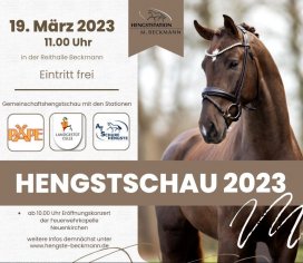 Am Sonntag, den 19. März, werden sich drei Hengste des Landgestüt Celles beim Züchterfrühschoppen der Partnerstation Beckmann präsentieren. Um 11 Uhr beginnt die Vorstellung der Hengste in Wettringen.