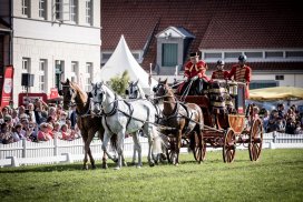Im Zentrum der Veranstaltung, dem Paradeplatz, wurde ein abwechslungsreiches Programm aus den Bereichen Dressur, Springen und Fahren dargeboten. Den Auftakt machte ein Dressurquartett mit Lektionen auf höchstem Niveau. In Perfektion tanzten die Hengste zum Takt der Musik und begeisterten damit die Zuschauer. Die Vorstellung einiger Springhengste unter dem Motto „Hoch hinaus“ machte seinem Namen alle Ehre, denn die fünf Pferde flogen mit Leichtigkeit über die imposanten Sprünge und hinterließen das Publikum beeindruckt. Eines der vielen Highlights waren die traditionellen Fahrschaubilder, wo die Besucher unter anderem die große Postkutsche und den Krönungswagen, gefahren von Ekkert Meinecke, bewundern konnten. Zum Abschluss jeden Tages versammelten sich die Besucher schließlich wieder um den Paradeplatz, um den Höhepunkt, die große Dressurquadrille bestehend aus 24 Hengsten, hautnah zu erleben.