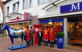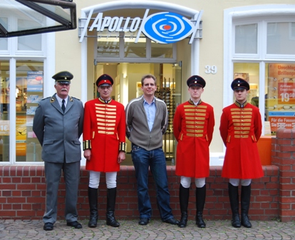 Und seine Passion für Pferde und zu seiner Heimatstadt Nienburg vereinigte er in dem Blauen Pferd, welches natürlich einen Hannoveraner Brand trägt und mit Motiven der Stadt Nienburg geschmückt ist. Und so steht es als Blickfang vor dem Geschäft in der Georgenstrasse in Nienburg . Das Ehepaar Matthies bot uns eine Plattform vor ihrem Traditionsunternehmen in der Innenstadt Nienburgs, natürlich direkt neben dem Blauen Pferd. Weitere Starthilfe bekamen unsere vier Gestüter von Herrn Schubach, seines Zeichens Filialleiter von Apollo Optik in der Langen Strasse. Hilfsbereitschaft in ihrer schönsten Form – Wir bedanken uns dafür!
