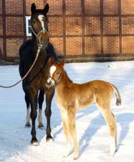 Das erste Fohlen ist ein Stutfohlen mit dem Namen Carlotta von Check In aus der Staatsprämienstute Emilie (Embassy x Carismo x Edinburgh). Helmut Böttcher hat mit diesem Fohlen die Fohlensaison 2013 im Pferdezuchtverein Winsen eröffnet und wird die junge Dame auf der Deckstelle in Roydorf im Rahmen eines Züchterabends präsentieren. Wir gratulieren Herrn Böttcher recht herzlich zu seinem tollen Nachwuchs!