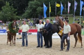 Mit dem Freispringen unter freiem Himmel startete die Verbandsstutenschau. Springsiegerstute wurde die St.Pr.A. Cunterbunte v. Cassini II/Garibaldi II (Z. u. Ausst.: Diedrich Meyer, Köhlen). Dieses vielversprechende Blut wird ab Oktober auch Einzug in das Landgestüt Celle nehmen. Bereits Anfang des Jahres hat sich Landstallmeister Dr. Brockmann ein Hengstfohlen von Gem of India aus der Halbschwester gesichert.Als wahres Schmuckstück präsentierte sich die Klasse der Halbblutstuten und unterstrich in beeindruckender Weise die Bedeutung unseres Vollbluthengstes Lauries Crusador xx für die Hannoveraner Zucht. Alle sieben Stuten führten den Star-Blüter als Vater in ihrem Pedigree. Die Siegerschärpe umhängen und die Ehrenrunde anführen durfte die St.Pr.A. Letizia von Lauries Crusador xx x Hohenstein (Z. u. Ausst.: Zuchtgemeinschaft Grube, Drochtersen).