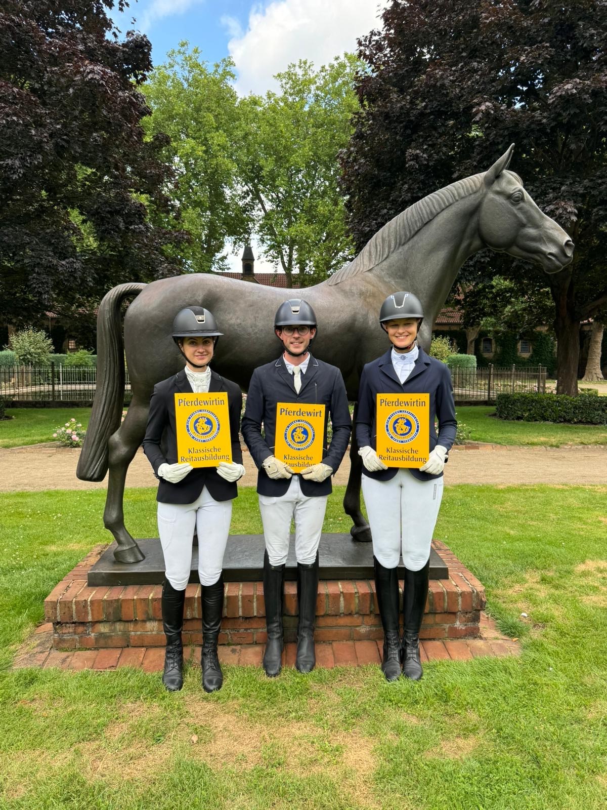 Über ihren gelungenen Abschluss zum Pferdewirt mit der Fachrichtung Klassische Reitausbildung freuen sich Jannik Onnenga, Charlotte Pischel und Carolin Reichwein.