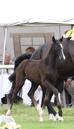Bei den Springfohlen überzeugte besonders ein Hengst aus den Reihen des Landgestütes - Avagon konnte sowohl den Sieger der springbetonten Stutfohlen als auch Hengstfohlen stellen! Aus dem Hause Achim & Walter Schacke, Wittingen, kommt die Stute vom Avagon aus einer Escudo I- Mutter. Besonders auffällig waren hier die gut getragene Halsung bei viel Schnabel, eine große Schulterpartie und die großzügige Kruppenformation. In der Bewegung war die Stute nicht weniger gut bedacht worden. Mit viel Mechanik und immer gut unter den Schwerpunkt fußend trabte sie zur Gesamtnote von 8,75 und damit zum Abteilungssieg.