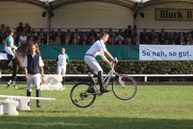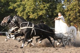 Die Ungarische Post ging nicht rasanter, die Rappenquadrille beeindruckte mit geballter Kraft und Dynamik, die Azubis boten einen Wettkampf Pferd gegen Mountainbike, der Fuhrpark wurde von unseren Fahrern perfekt in Szene gesetzt und spätestens bei der Freiheitsdressur war das Publikum auf den Beinen. Die große Dressurquadrille war Weltklasse – Präzision in Perfektion von 24 Hengsten in dunkler Jacke gezeigt, ist auf diesem Niveau einzigartig. Donnernd verabschiedeten die Römerwagen die Gäste an diesem Wahlsonntag.