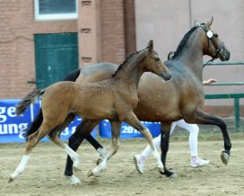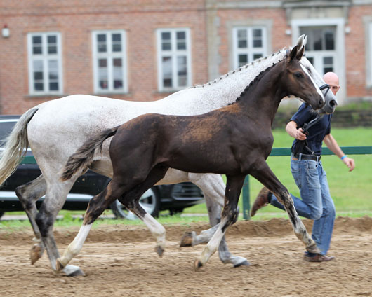 Balou Peggio x Sandro Song x Kobold I lautet die Anpaarung des Siegerfohlens der springbetonten Hengstfohlen. Der schwarzbraune Hengst von Ulrich Pehl aus Putbus erreichte einen Punktwert von 83 (Wertnote 9,22). Die Richter vergaben durchweg 9 und für die Bewegung gleich dreimal die 9,5.
