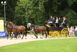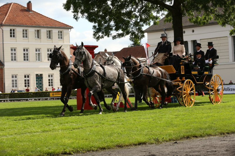 Abends traf man sich im Reithaus des Landgestüts zu einem festlichen Abendessen, zu dem als Ehrengast auch Celles Oberbürgermeister Nigge anwesend war. Am nächsten Morgen ging es früh auf die Geländestrecke, bei der der wunderschöne französische Garten Anlaufpunkt für viele Fahrsportinteressierte war. Auf der Strecke galt es diverse, den historischen Gespannen angepasste Gehorsamsübungen zu absolvieren. Am Sonntagnachmittag wurde das Grün des Paradeplatzes im Landgestüt ein weiteres Mal Treffpunkt des Geschehens, denn nun mussten die Gespanne im Kegelfahren gegeneinander antreten.